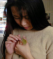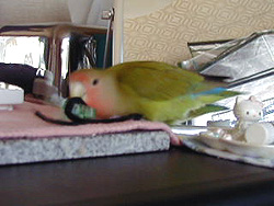 | ついに、こんなところで水浴びをしてしまった、せい。。。慌てていつもの水浴び容器を出してあげたんだけど、 それじゃあ気に入らないみたいで・・・グラスが倒れるんじゃないかと心配でした。透明なガラスが好きなのかなぁ・・・? |